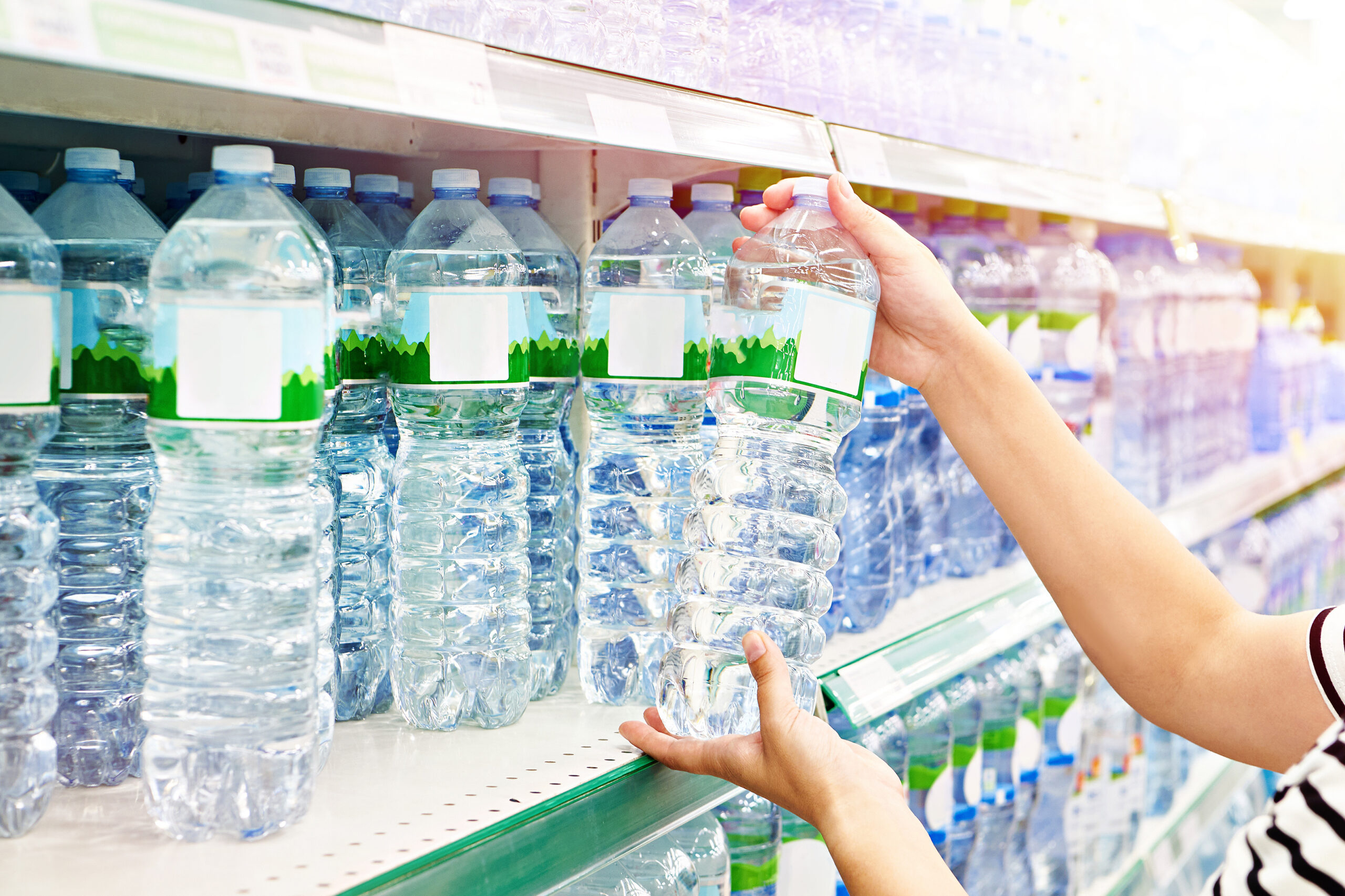 Hand with bottles of water in store